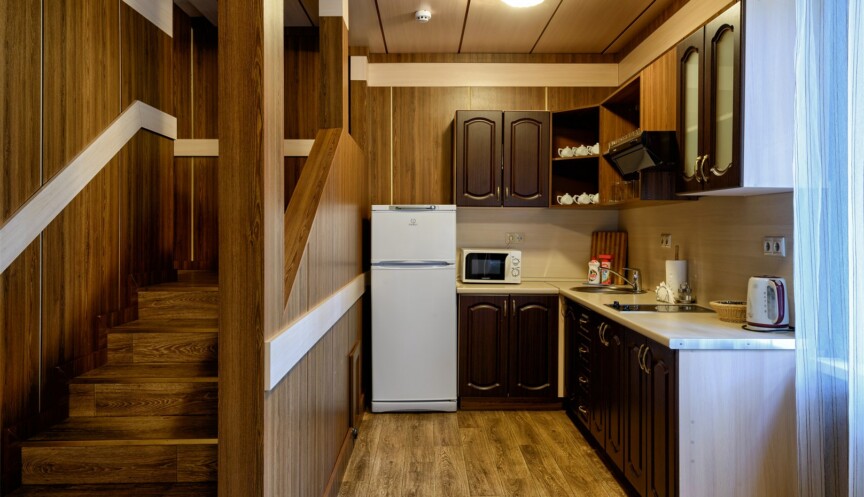 1-ый этаж: Прихожая: шкаф-купе, зеркало, фен. Спальня: шкаф-купе, двуспальная кровать, 2 прикроватные тумбы, 2 настольные лампы, комод, телевизор 32 дюйма, телефон. Кухонная зона: холодильник, электроплита 2 нагревателя, вытяжка, кухонные шкафы, посуда (кастрюля 3 л. и 2 л., тарелки, чашки, ножи, стаканы, стопки, столовые приборы, доска разделочная) Зона отдыха: стол, 12 стульев, буфет, телевизор 42 дюйма, тумба, минибар, телефон, датчик температуры воздуха, биокамин, самовар электрический. Мокрая зона: 2 душевые, 1 душ-бочка, купель с гидромассажем и подсветкой (2,46 * 1,56 * 1,20), выход на улицу. Парилка: печь, ковш, ушат. Санузел: унитаз, раковина, зеркало.